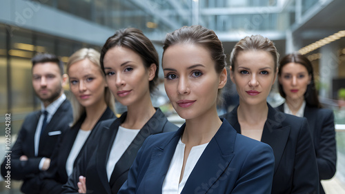 Diverse group of professionals in business attire standing confidently in modern office lobby, symbolizing dynamic labor market and urban work environment.