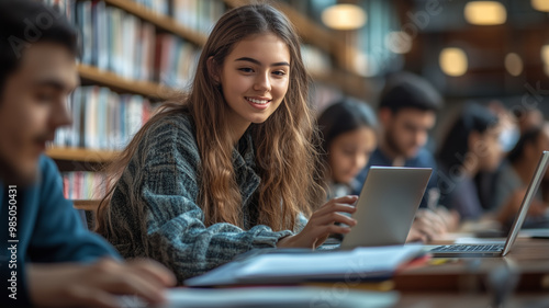 Diverse Group of Students Collaborating on a Project. A girl is sitting at a table with a laptop and a tablet. She is smiling and she is enjoying her work.