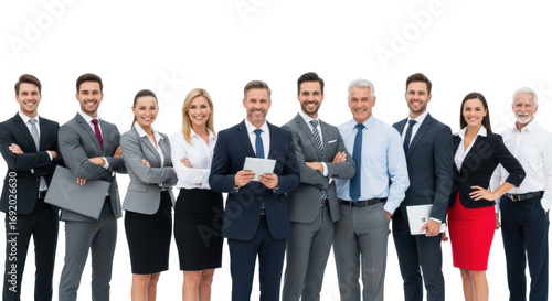Diverse group of ten confident caucasian business professionals in formal attire, smiling, bright studio, white copy space background, concept of corporate diversity and success