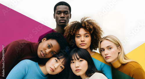 Diverse Group of Young Individuals Wearing Colorful Sweaters Showcasing Friendship and Unity in a Minimalist Setting