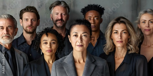 Diverse group standing in a row facing camera with neutral expressions. Concept Group Portrait, Diversity, Neutral Expressions, Standing in a Row, Facing Camera