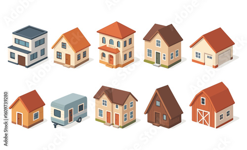 Diverse isometric houses collection featuring modern, traditional, and rustic designs