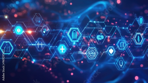 Diverse medical icons and technology symbols displayed in a futuristic design, illustrating healthcare innovation and advancements in medicine.