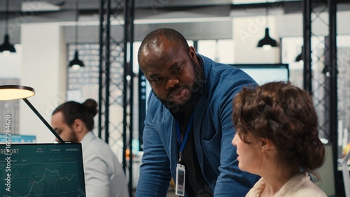 Diverse office coworkers reviewing monthly data graphs to create reports, applying business strategy and analysis to drive innovation and improve company performance. Work alliance. Camera B.