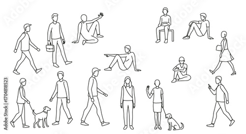 diverse people outlines black and white line drawings of people in various activities for web design simple style clean isolated vector