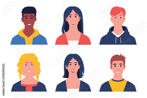 Diverse Portrait Collection: A collection of six stylized portraits showcasing a variety of faces, skin tones, and expressions, representing the beauty of human diversity.