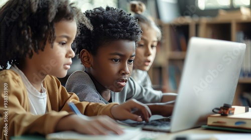 Diverse primary school children collaborating on a laptop during engaging classroom learning session