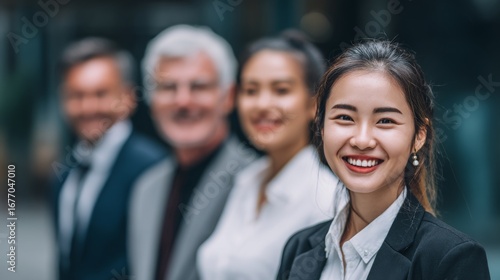 Diverse professionals from different fields are gathered in front of a sleek, modern office building