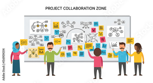 Diverse team collaborates on project strategy displayed on whiteboard with sticky notes, fostering creativity and collaborative planning in a workspace.