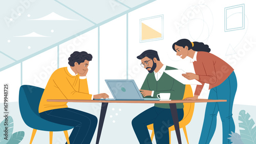 Diverse team collaborating on a project in a bright, modern office. Colleagues discuss ideas and work together on laptops, showcasing teamwork and innovation.
