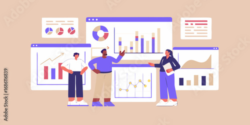Diverse team of professionals analyzing financial data and charts on computer screens during a business meeting