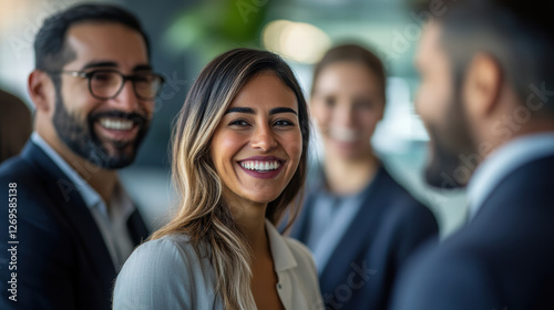 diverse team of professionals smiling and engaging in conversation, showcasing teamwork and collaboration in modern office environment
