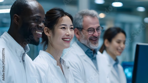 Diverse team of smiling scientists in lab coats collaborating and looking at data on a computer screen with a bright background.