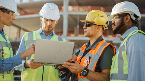 Diverse Team of Specialists Use Laptop Computer on Construction Site. Real Estate Building Project with Civil Engineer, Architectural Investor, Businesswoman and Worker Discussing Blueprint Plan