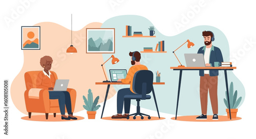 Diverse team working remotely from home offices, perfect for illustrating work-from-home concepts on websites or brochures.