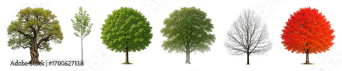 Diverse tree set including lush green, bright red, and bare winter varieties isolated. Natural elements for landscaping and design.