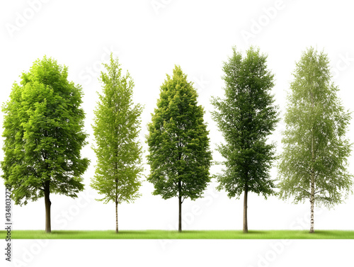 Diverse Tree Species on Bright Green Grass Against White Background