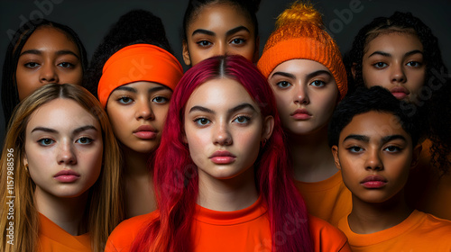 Diverse Women in Orange, A Portrait of Unity and Strength, Wearing Vibrant Hues, Projecting Confidence and Solidarity