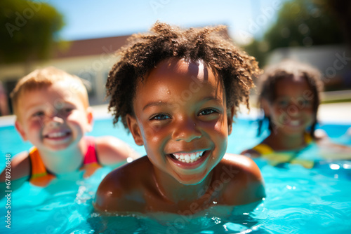 Diverse young children enjoying swimming lessons in the pool having a fun time while learning with their friends