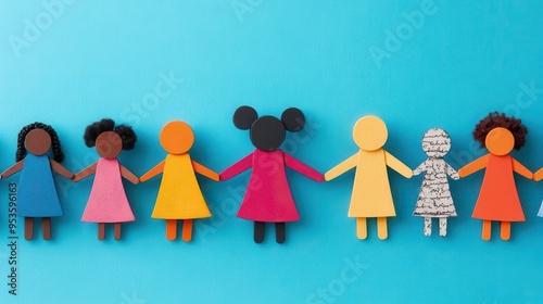 Diversity and Inclusion Concept: Colorful Paper Dolls Holding Hands on Blue Background
