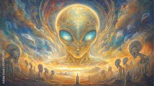 Divine alien beings worshipped by ancient cultures in ethereal sky painting. Alien Rituals & Ceremonies. Illustration