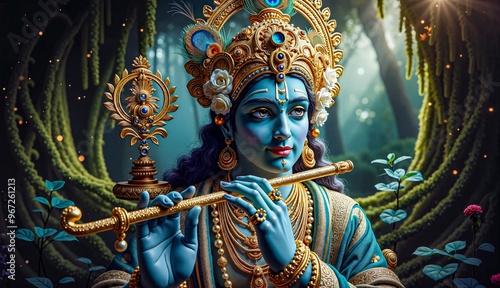 Divine Krishna Playing Flute in Enchanted Forest