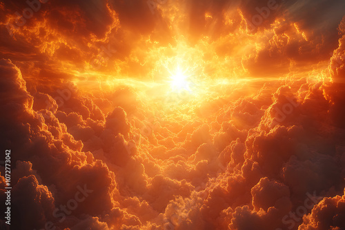 Divine light breaking through dark clouds, illuminating the landscape below, capturing a powerful and dramatic scene that symbolizes God's presence and spiritual power.