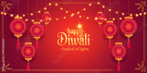 Diwali Festival Banner Featuring Traditional Indian Paper Lanterns Hanging Against a Rich Red Gold Background with Glowing Fairy Lights Festive Patterns Ideal for Holiday Greetings Digital Invitations