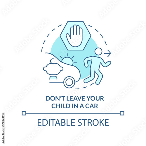 Do not leave your child in car turquoise concept icon. Trip with toddlers advice abstract idea thin line illustration. Isolated outline drawing. Editable stroke. Arial, Myriad Pro-Bold fonts used