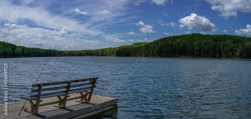 Dock with a bench with a fishing rod overlooking a blue lake.