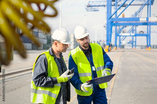 Dock workers with walkie-talkie and clipboard meeting at shipyard