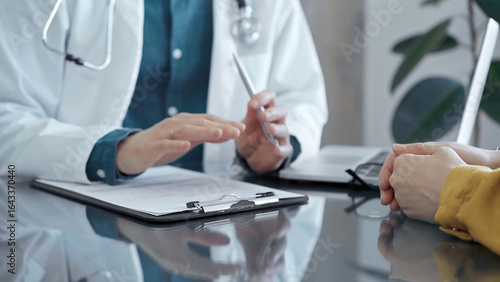 Doctor and patient consultation in clinic. Patient listens attentively as a doctor explains a diagnosis in a modern medical office. Medicine and health care