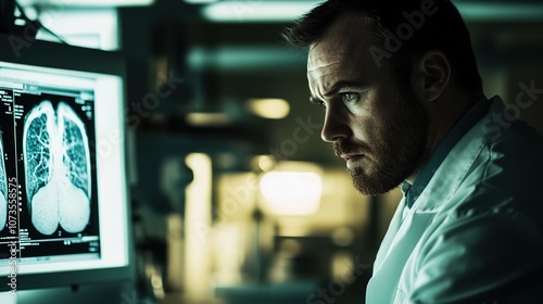 Doctor carefully examining lung scan results, focusing on patient's health and medical diagnosis. Professional dedication and attention to detail in healthcare.