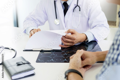 doctor giving a consultation discussing to patient and explaining medical informations and diagnosis, Medicine and health care concept