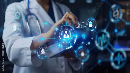 Doctor hand with stethoscope and Ui icon medical in hospital with medical technology network concept