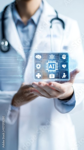 Doctor holding AI chatbot interface with health data and medical icons, medical chat bot, diagnose medical reports, doctor AI