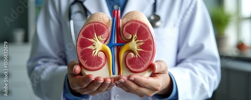 Doctor holds anatomical kidney model. Healthcare concept. Medical professional in white coat with stethoscope demonstrates kidney anatomy. Health care, treatment, surgical intervention, diseases of