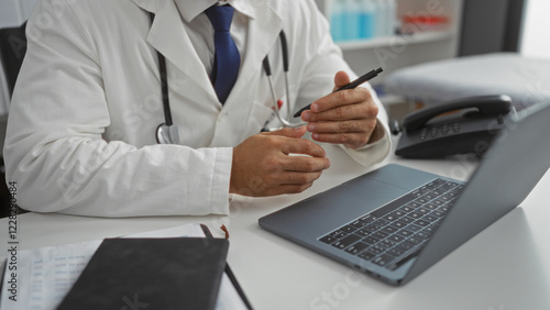 Doctor in hospital wearing white coat works with laptop while holding pen and discussing patient records, demonstrating a professional medical environment.