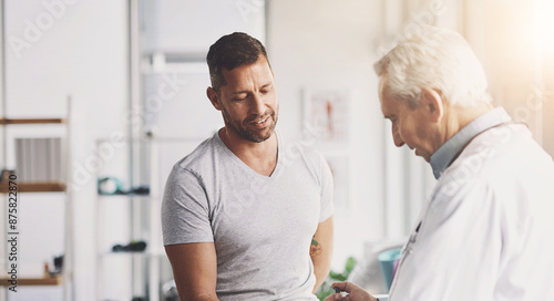 Doctor, man and patient in consultation or healthcare with insulin pen for diabetes, injection and treatment. Senior professional, health insurance and glucose check with blood pressure and checkup