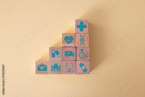Doctor putting and stacking wooden block cube which print screen health care and medical icons for healthy and wellness concept.