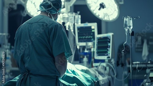 Doctor scrubs and monitor with machine in theatre for surgery cardiology analysis and information Medical man and digital technology in hospital for operation procedure or healthcare e : Generative AI