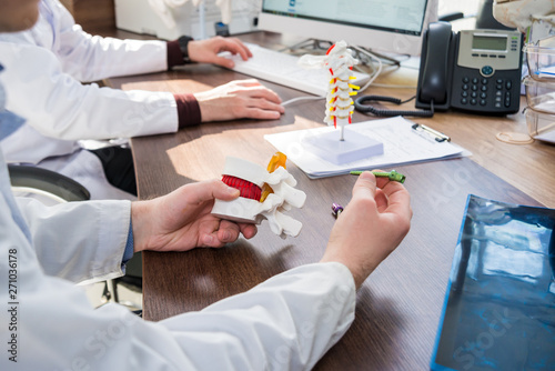 Doctor show polyaxial screw on the spine model. Spine fixation systems