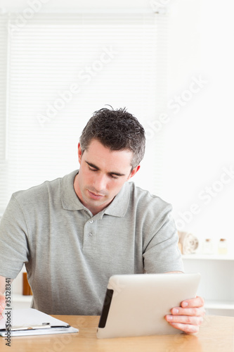 Doctor sitting at a table with a tablet and a chart