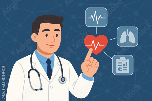 Doctor using a futuristic virtual interface for heart diagnostics. Cardiologist analyzing ECG, medical data. Concept of telemedicine, digital health, and healthcare technology.