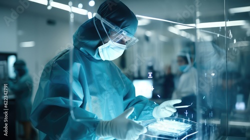 doctor working in futuristic hospital with medical high tech healthcare, surgeon team operation on heart disease and illness on monitor, Generative AI