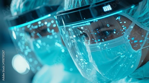 Doctors and nurses close-up, discussing patient care in a modern clinic, soft lighting with digital overlay of medical data and diagnostics