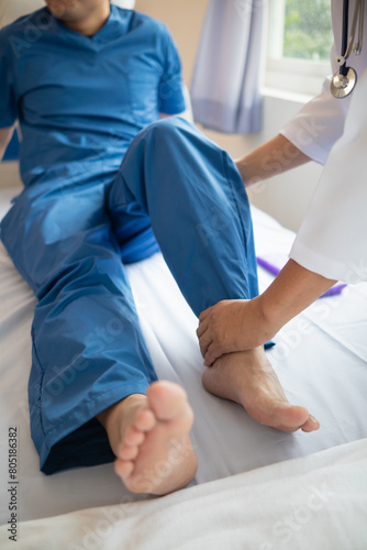Doctors are examining patient muscle injuries and doing physical therapy for patient to move muscles so they can be used regularly because physical therapy will help strengthen muscles and blood flow.