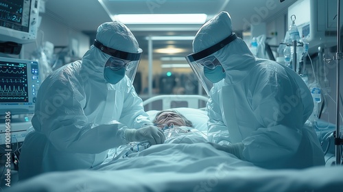 Doctors in Protective Suits Working with Patient. Two doctors in protective suits attend to a patient in a hospital setting, illustrating safety protocols in healthcare during critical situations.