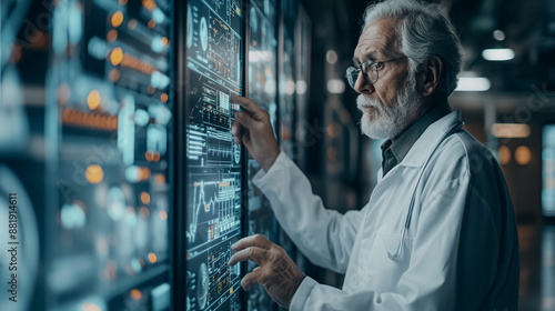 Doctors using AI-powered diagnostic tools in a hospital, analyzing patient data and providing treatment recommendations on advanced digital screens, high-tech medical environment.