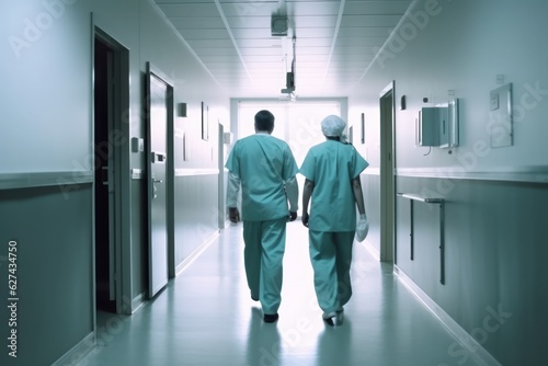 Doctors walking down hospital corridor, medical background concept generative ai